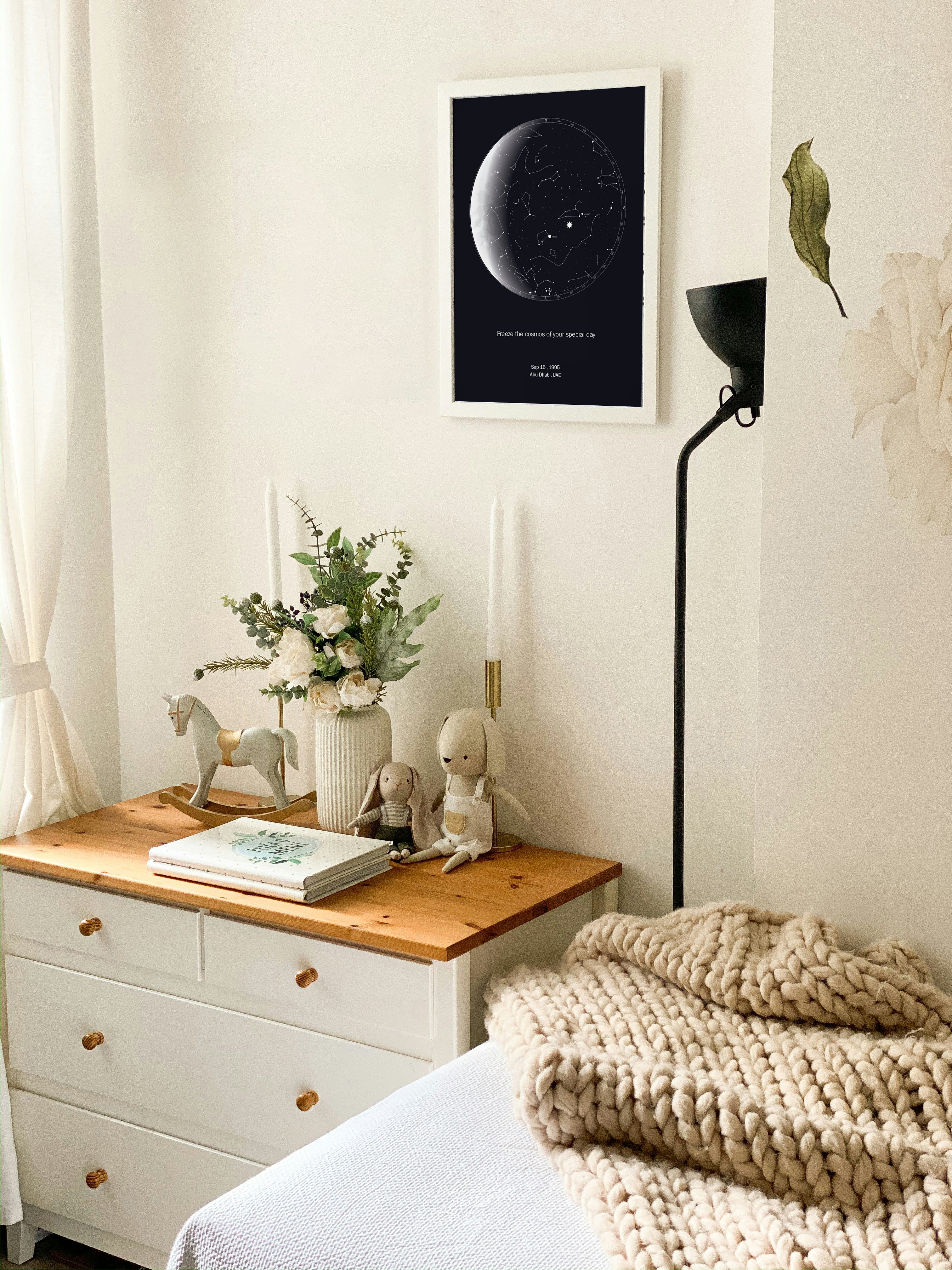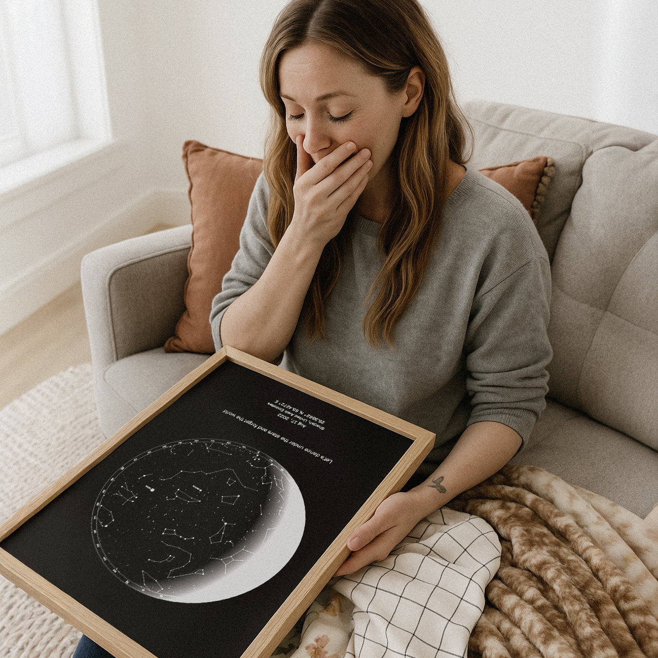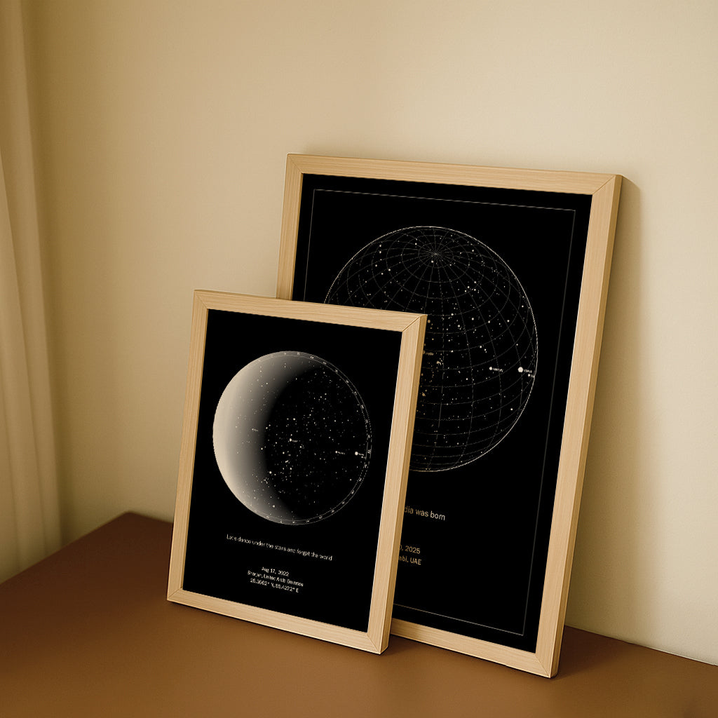 A starmap is a custom artwork that captures the exact alignment of stars at a specific date and location — like the night you met, got married, or were born.