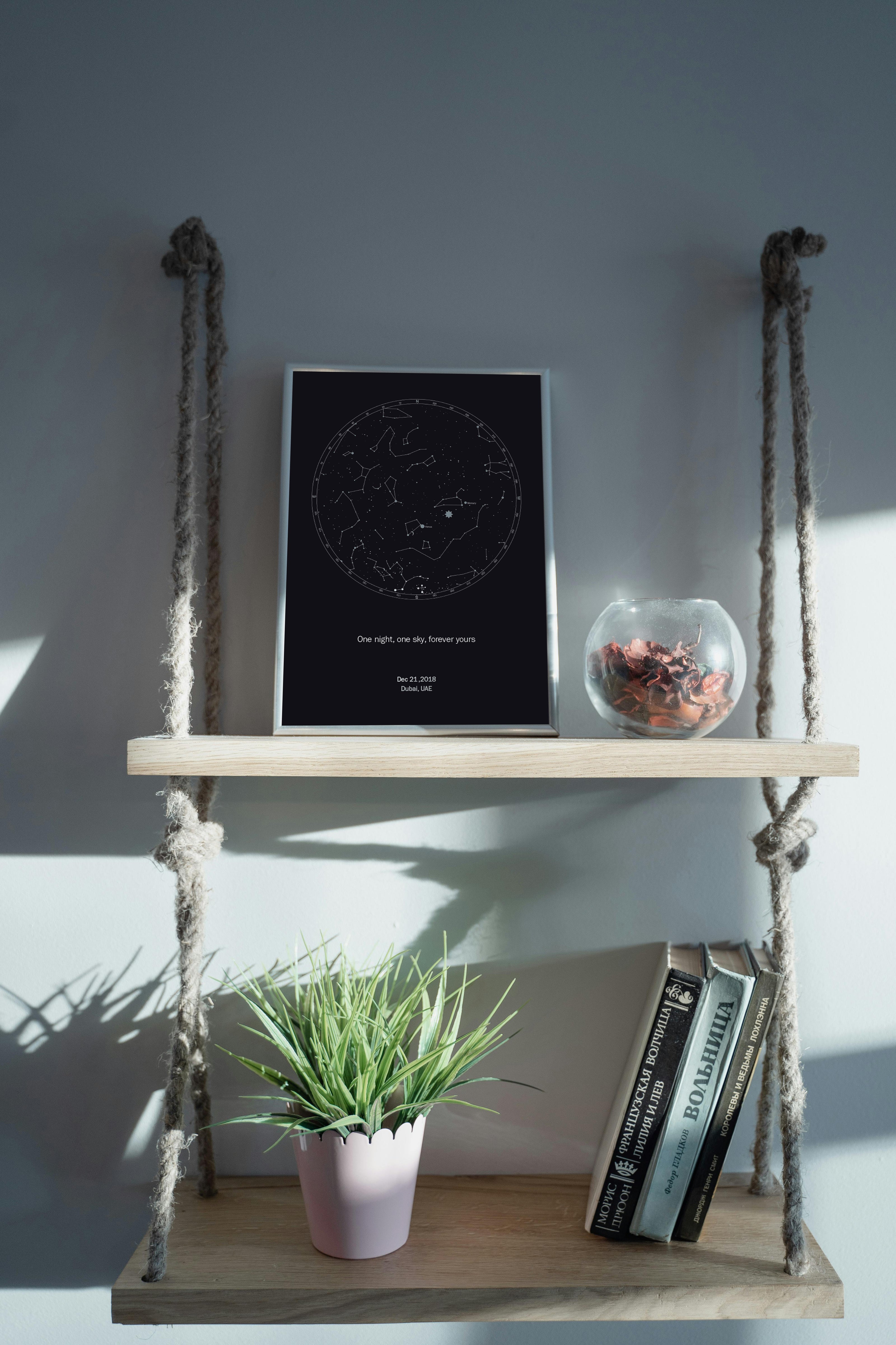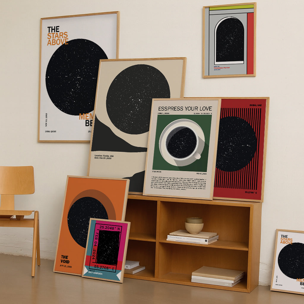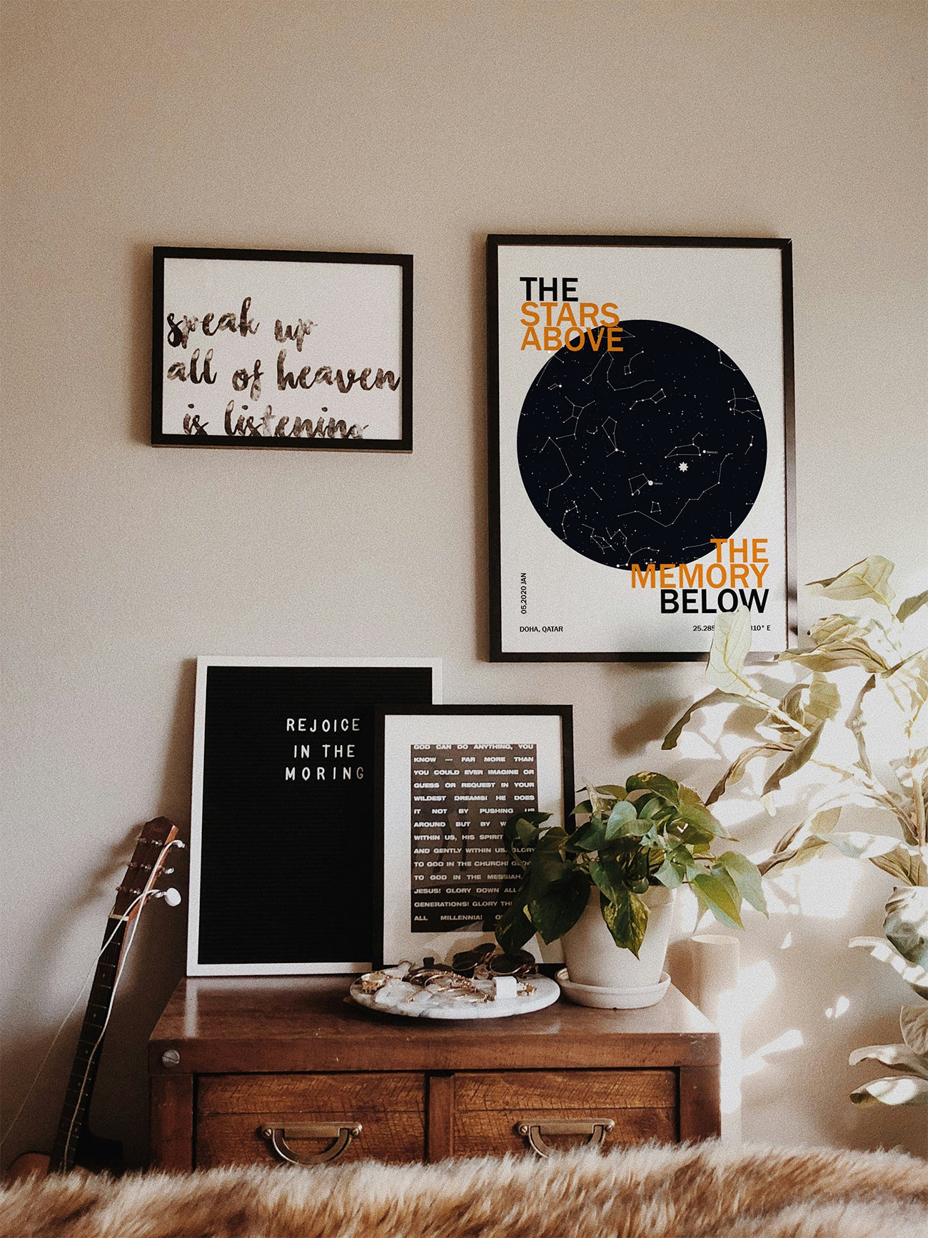 A starmap is a custom artwork that captures the exact alignment of stars at a specific date and location — like the night you met, got married, or were born.